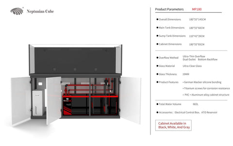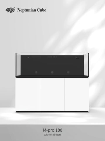 The Neptunian Cube M-Pro 180 is a premium all-in-one aquarium system crafted for serious reef hobbyists seeking innovation and reliability. This high-end setup creates stunning underwater worlds for corals, fish, and reef structures, blending advanced features with sleek design at an exceptional value. With its ultra-clear, low-iron 19mm thick glass panels, the M-Pro 180 offers distortion-free views and robust strength in dimensions of 180 x 55 x 60 cm. Choose from black or white finishes to match your space and enjoy the integrated cabinet for organized storage of pumps and supplies.