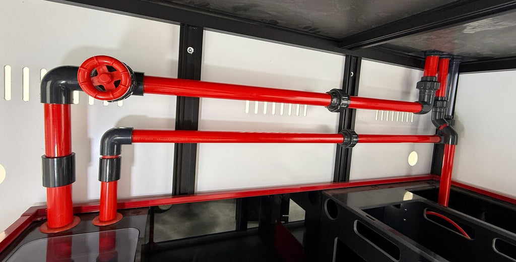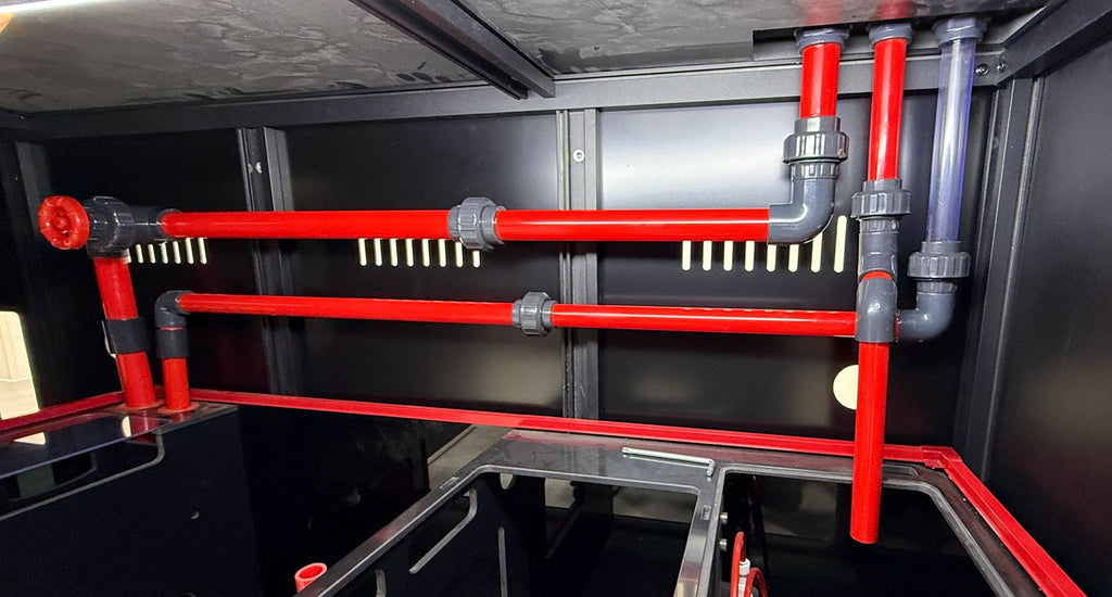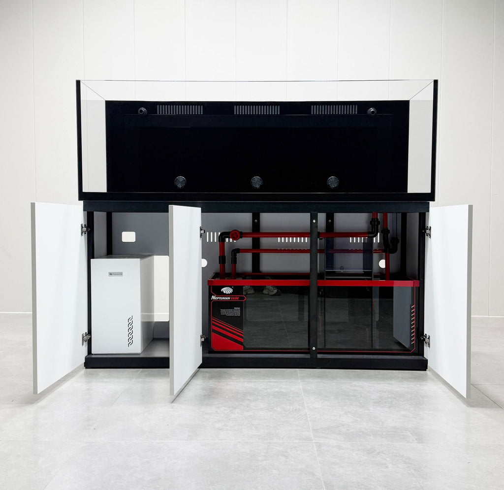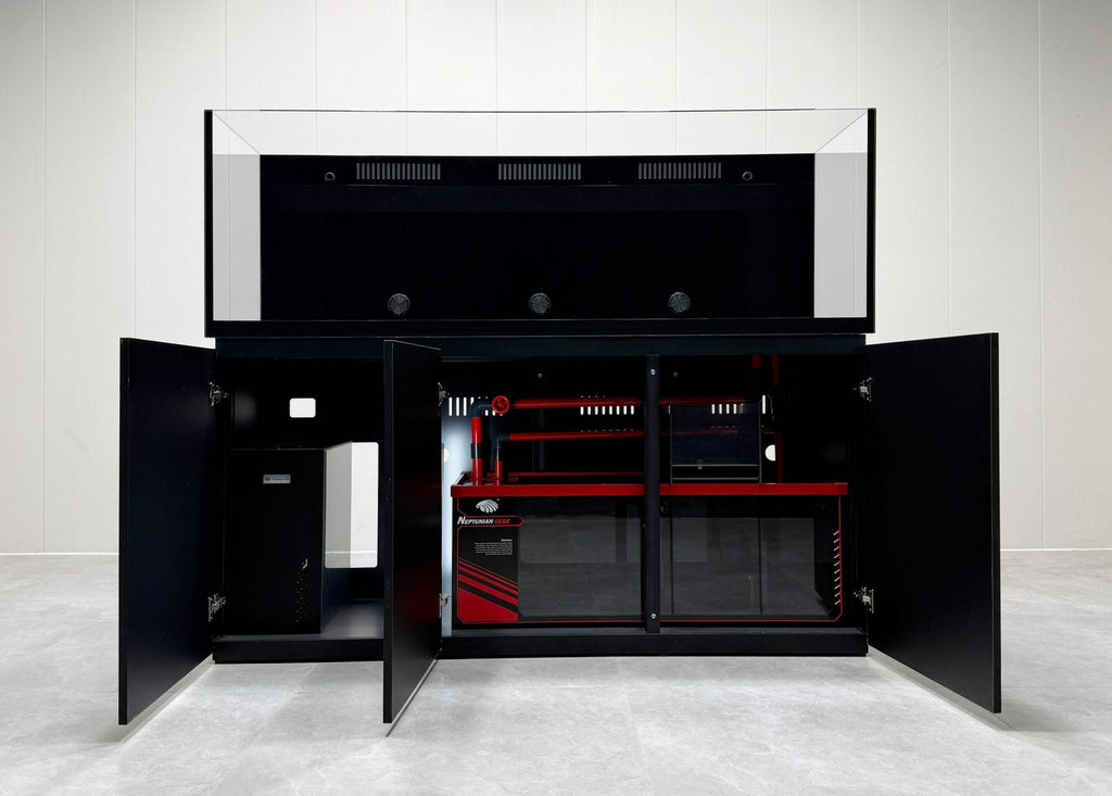 The Neptunian Cube M Pro series is a highly advanced reef aquarium with affordability in mind, featuring the ‘world's thinnest’ weir box, stealth pipework, and an opti-white highly polished aquarium. Complete with the Neptunian Cube is the stylish grey and red pipework and gate valve alongside the hybrid glass and acrylic sump matching the red and black aesthetics. The fully adjustable multi-chamber sump with dedicated skimmer, reactor, and refugium chambers, Unique to the Neptunian Cube M Pro is the electronic dry box to ensure all your plugs, and controllers are safe from water damage.
