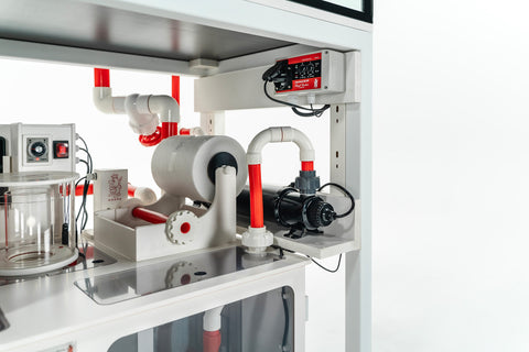 Das System wird fertig verrohrt als Plug and Play ausgeliefert. An den Innenseiten des Aquariumschranks sind die Controller sowie die UV-Anlage an Magnetleisten befestigt. Alle Netzstecker werden von uns beschriftet und die Elektrokabel werden in einem Kabelkanal sauber verlegt.